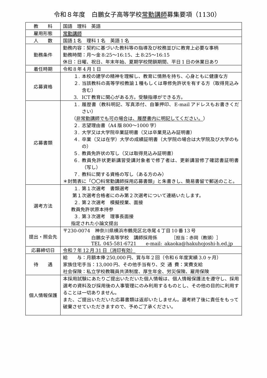 白鵬女子高等学校 講師採用係