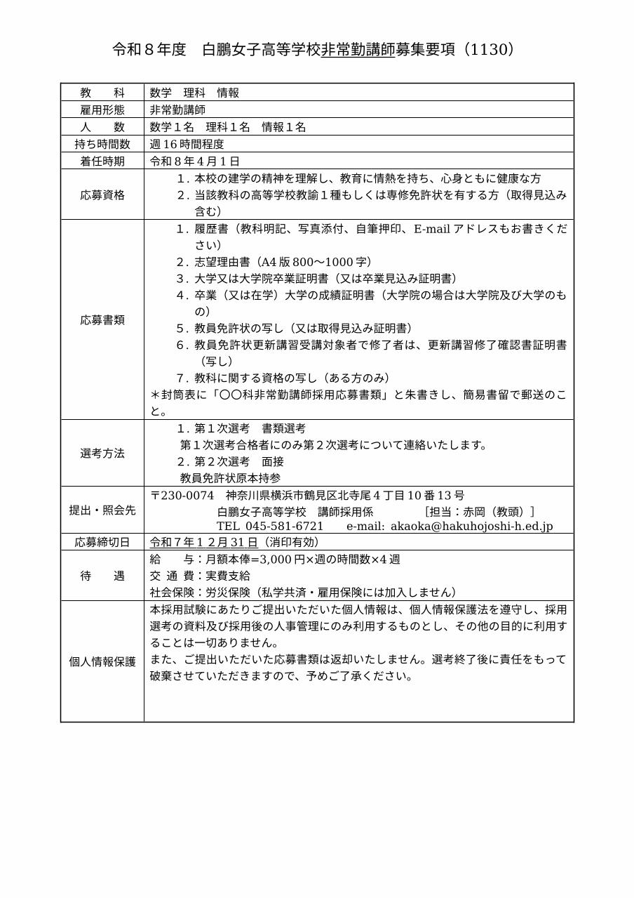 封筒表に「数学科非常勤講師採用応募書類」と朱書きし、簡易書留で郵送のこと。
